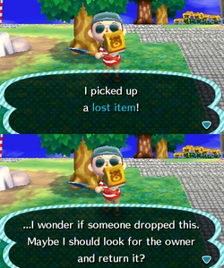 - "I picked upward a lost item! ... I wonder if someone dropped this. Maybe I should look for the possessor and render it?" —Brute Crossing: New Leaf